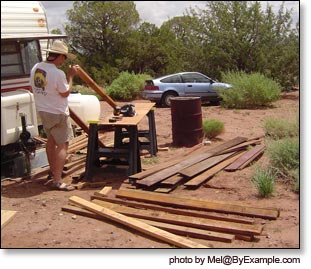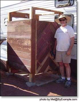 Building our outdoor solar shower, constructing a picnic table, and sealing the roof of our travel trailer. Photos August 2006.